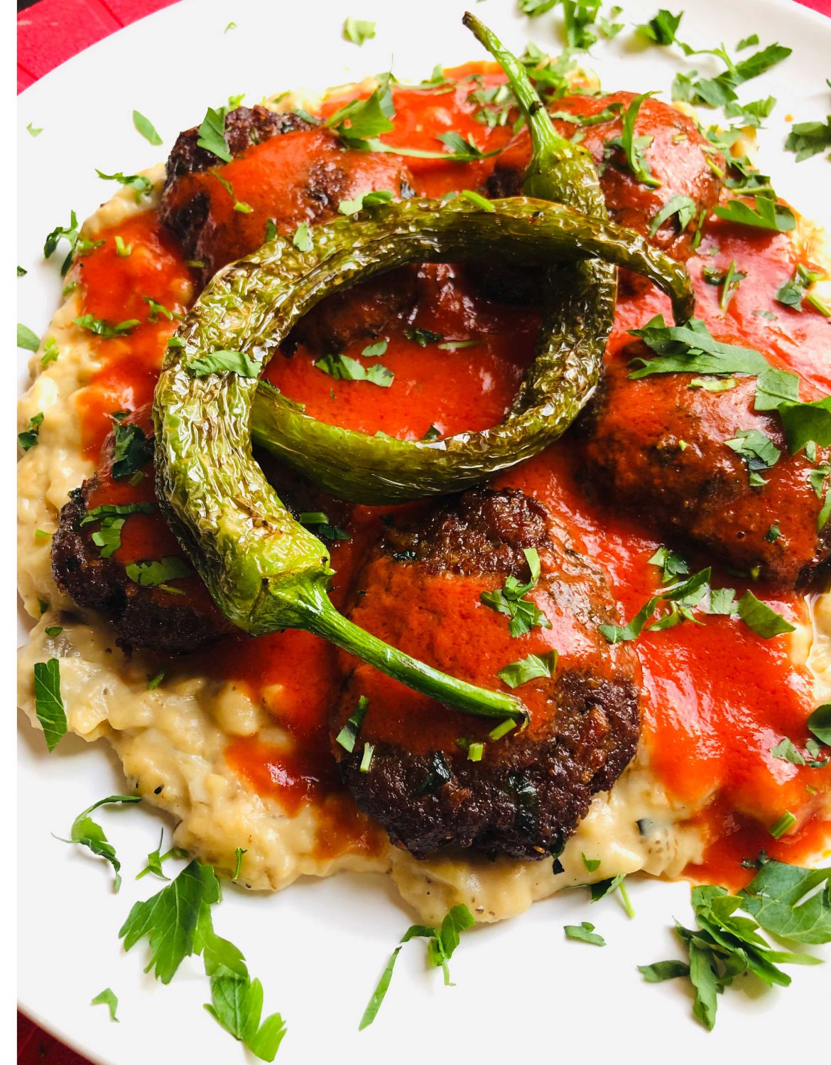 Geniş bir servis tabağına beğendiden alıp tabanına yayın. Üzerine köfteleri dizip son olarak sosu üzerine gezdirin. İşte bu kadar! Artık sahne sizin, doya doyaaa yiyin… Şifa olsun…