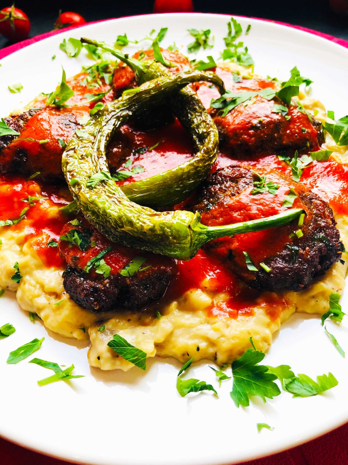 • Geniş bir servis tabağına beğendiden alıp tabanına yayın. Üzerine köfteleri dizip son olarak sosu üzerine gezdirin. İşte bu kadar! Artık sahne sizin, doya doyaaa yiyin... Şifa olsun...