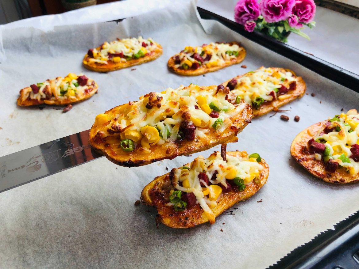 Hızlı bir şekilde yine bir fırça yardımı ile ince bir katman sostan tüm patateslere sürün. Sosun üzerine birer tutam rendelenmiş kaşar serpin. Kaşarların üzerine küp doğradığınız sucukları, küçük doğradığınız biberleri, haşlanmış mısırları ve tekrar rendelenmiş kaşarları pay edip tekrar fırına verin. Kaşarlar eriyene kadar yaklaşık 3 dakika fırında tutun. Fırından çıkarıp sıcak sıcak servis yapın. Tadına doyamayacaksınız.