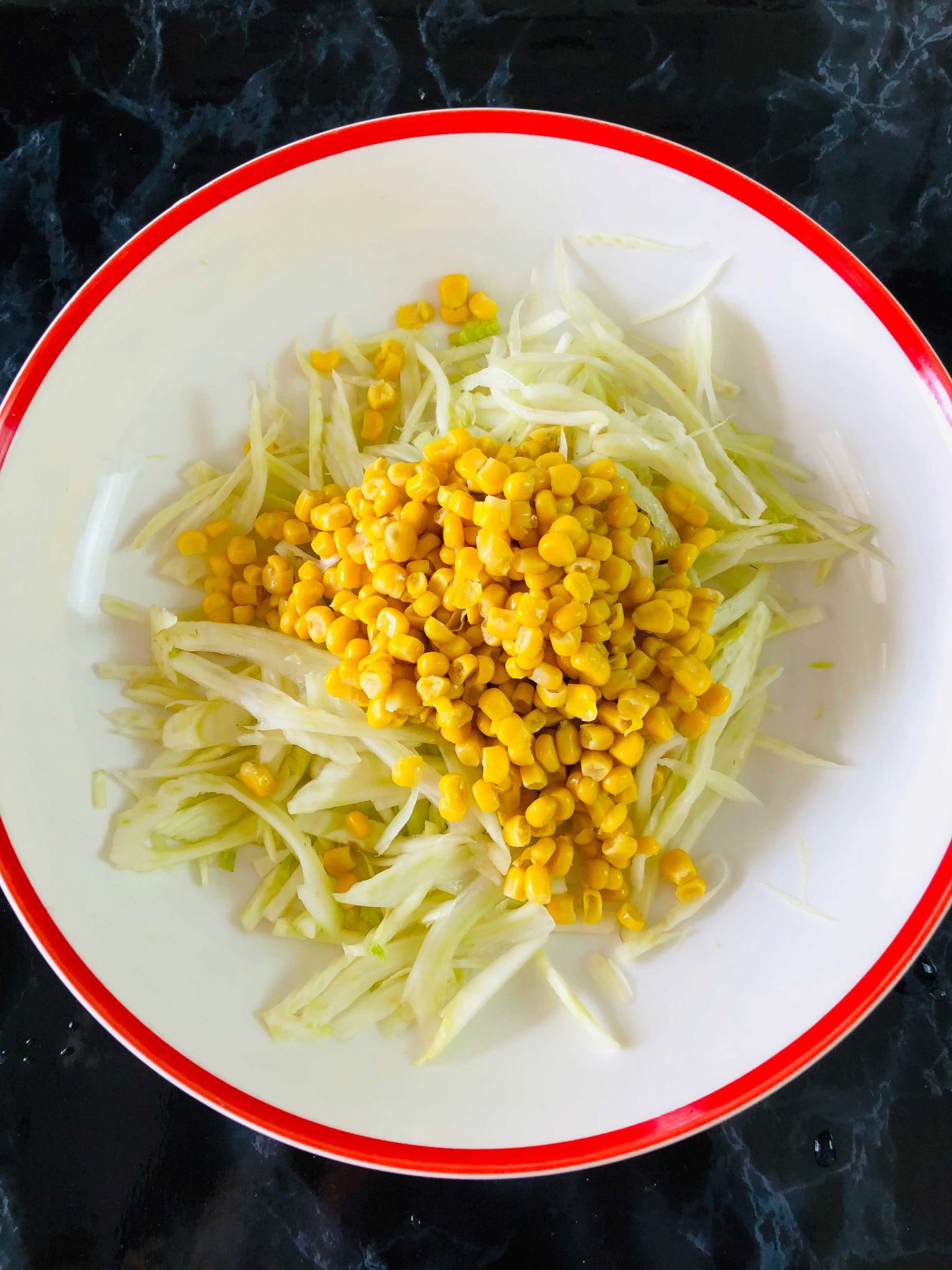 Rezenenin sap kısmını koparıp yıkayın. Boyundan enli kalacak şekilde ikiye kesin tıpkı soğan gibi. Kestiğiniz parçanın düz kısmını kesme tahtasına yatırıp uzunlamasına ince ince jülyen doğrayın. (piyazlık soğan doğrar gibi) Hepsini doğradıktan sonra üzerine çok az tuz gezdirip elinizle ovarak biraz yumuşatın rezeneleri. Daha sonra karıştırma kasesine aktarın. Mısırları kutusundan çıkarıp suyun altında süzerek yıkayın ve süzün. Rezenelerin üzerine aktarın. Peynirleri küp küp doğrayıp ekleyin. Şimdi gelelim sosuna…
