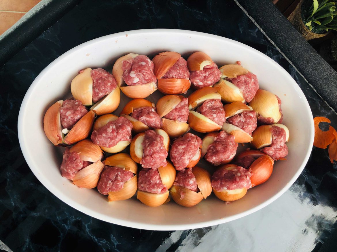 • Kestiğiniz soğanları sol elinize alın ve ağzını açabildiğiniz kadar açın. Sağ elinizi de önce su dolu küçük bir kaseye batırıp harçtan parmak uçlarınızla bir parça koparın. Elinizin içinde yavaş yavaş sıkarak toparlayın ve hoooop soğanın ağzının tam ortasına bırakın. İki avcunuzun içinde her ikisini iyice birbirine sabitleyin. Tepsinin dış kenarından başlayarak dizin. Tüm malzemeler bitene kadar aynı işlemi yapın.