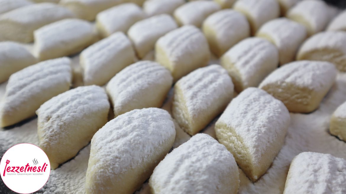 Hamuru tezgaha alıp portakal büyüklüğünde parçalar koparıp elinizde silindir şekli verip tezgahta ileri geri hareketlerle uzatın. Kenarlarını ve etrafını düzelterek elinizle üzerine hafif baskılar uygulayın. Eni 2 parmak genişliğinde olmalı. Daha sonra istediğiniz büyüklükte keserek yağlanmamış fırın tepsisine dizin. Fırını 170*C ye ayarlayıp ısınmaya bırakın. Bütün hamura kurabiye şekli verdikten sonra önceden ısıtılmış fırına verin. Üzerinin pembeleşmesine fırsat vermeyin. 20 dakika sonra fırından çıkarıp hiç dokunmadan tepsi içinde soğumasını bekleyin. Ilıkken üzerine bol pudra şekeri serpin. Tamamen soğuduktan sonra servis yapabilirsiniz. İçerisinde yumurta olmadığı için uzun süre tüketebileceğiniz içi kıyır üzeri yumuşak mis kokulu mükemmel bir un kurabiyesi.